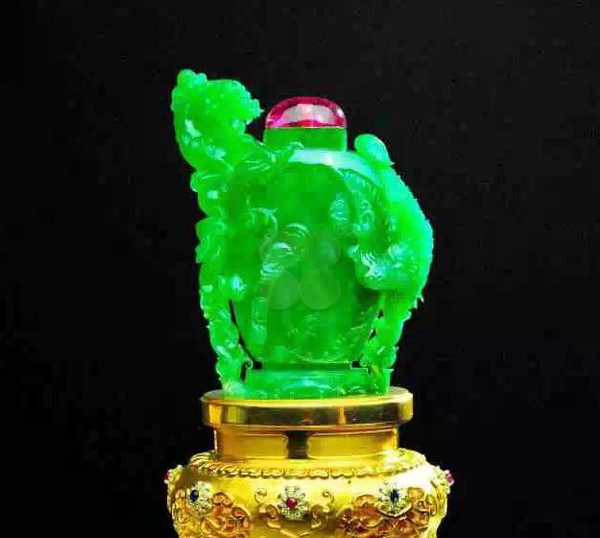 块翡翠是极为高档的水漾绿,虽然料子不大,但却是满绿,没有夹杂任何杂色,是一块稀世珍宝,单论材料都价格不菲。而此鼻烟壶的设计理念是中国传统的龙凤呈祥,符合中国人的传统审美。酸桃红碧玺做的壶盖,和壶身的翠龙搭配,又有了龙护珠、凤朝阳的感觉,把中国民间玉雕的传统理念发挥的淋淋尽致,堪称翡翠摆件精品。